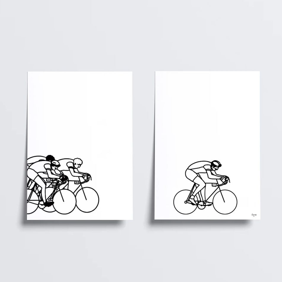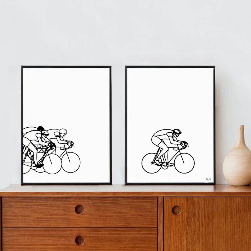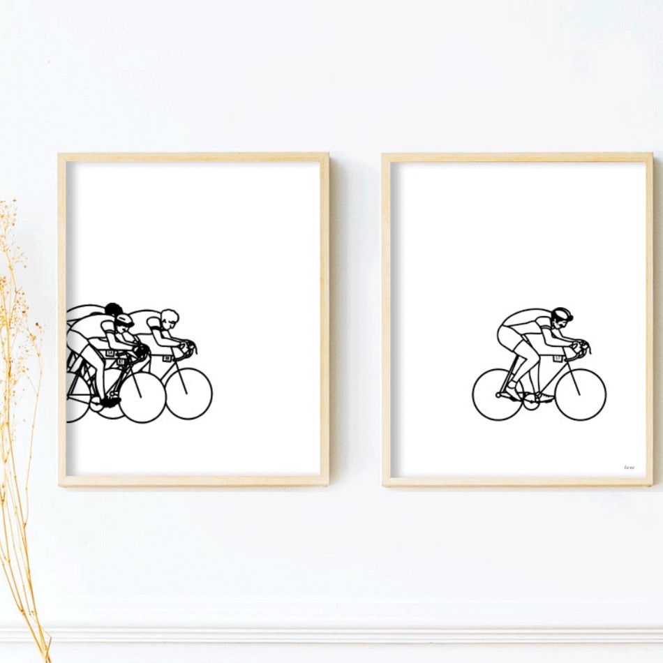 Le cyclisme à l’honneur dans ce duo d’affiches au style graphique et contemporain. Pensées pour les amateurs de vélo, ces illustrations sobres et dynamiques évoquent la passion du sport sans en faire trop.
