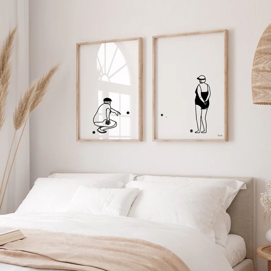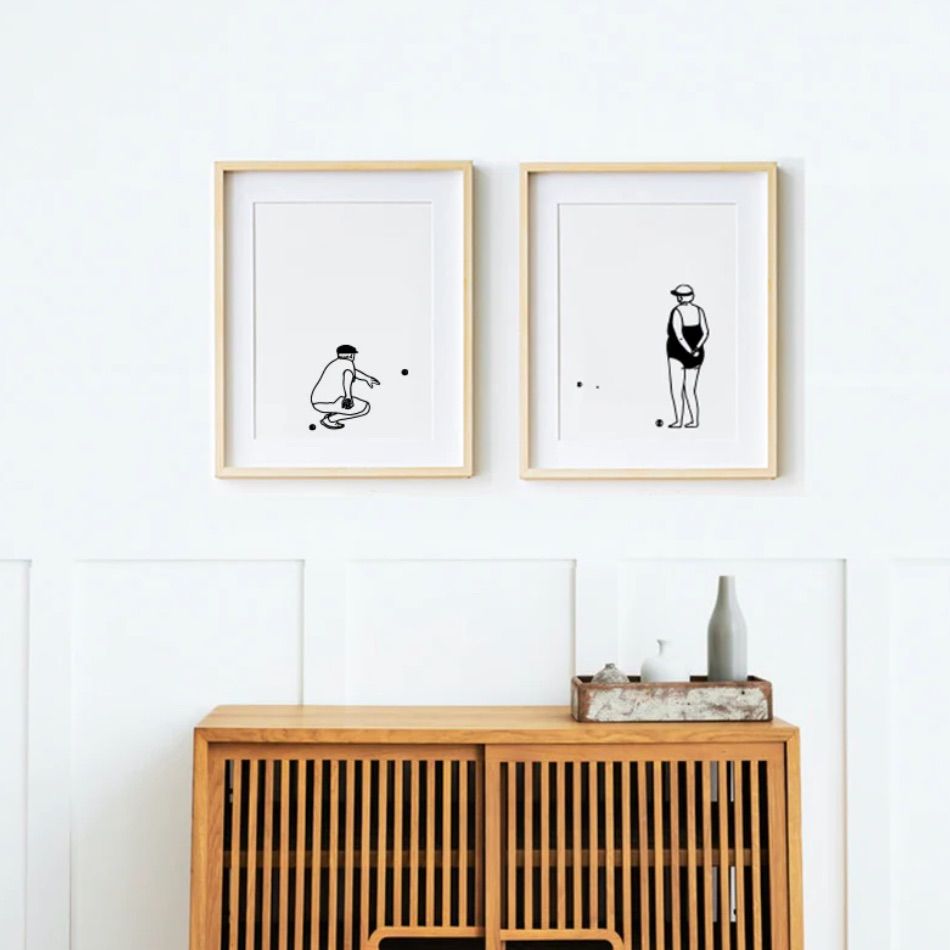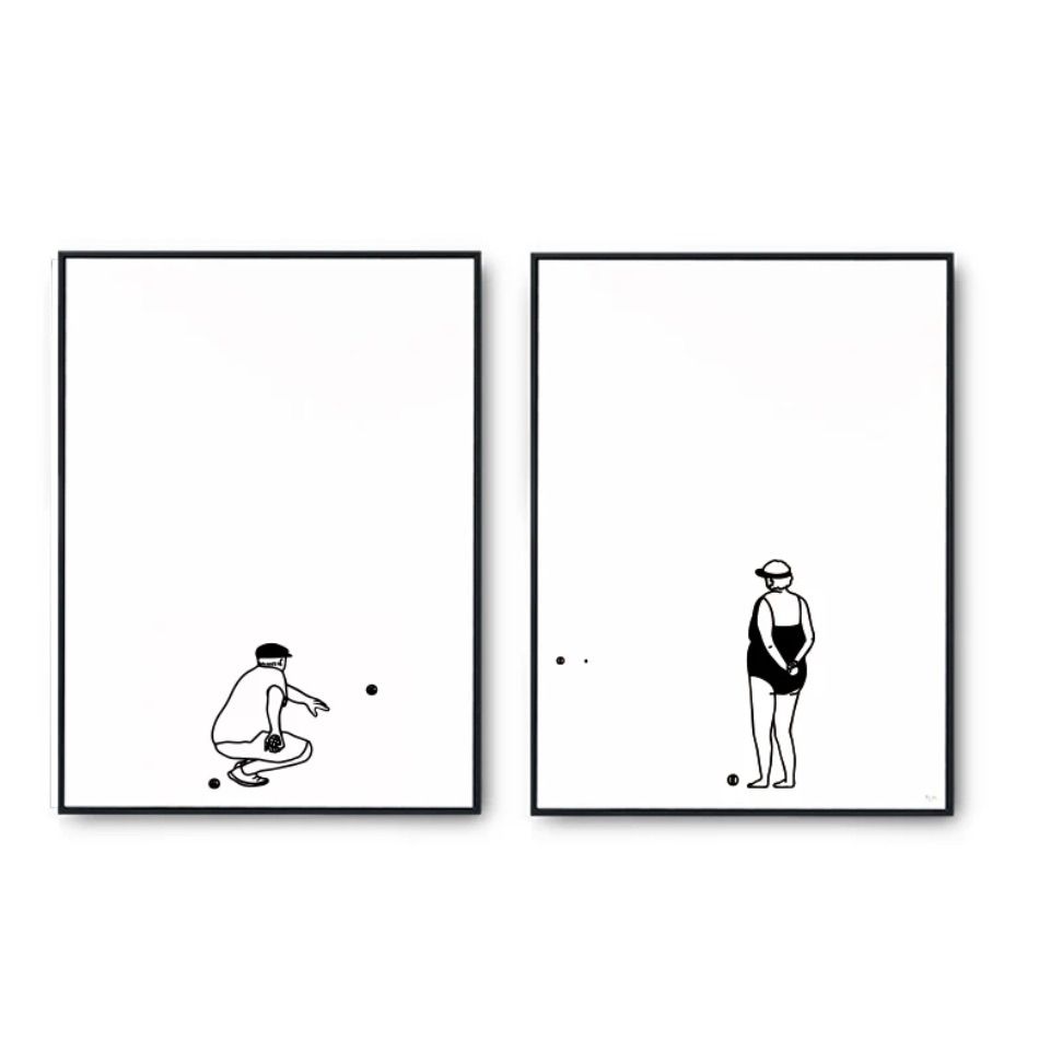 Ce duo d’affiches illustre avec finesse un couple de joueurs de pétanque dans un univers graphique et épuré. Une mise en scène sobre, moderne, parfaite pour un intérieur chaleureux et personnel.