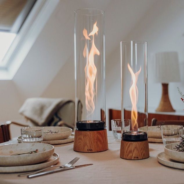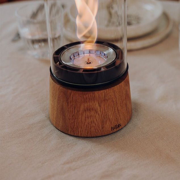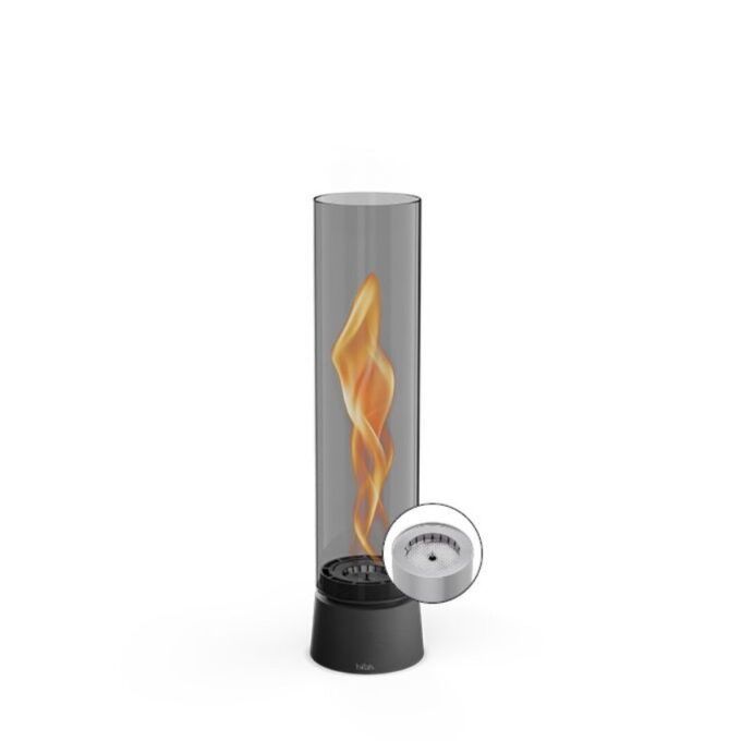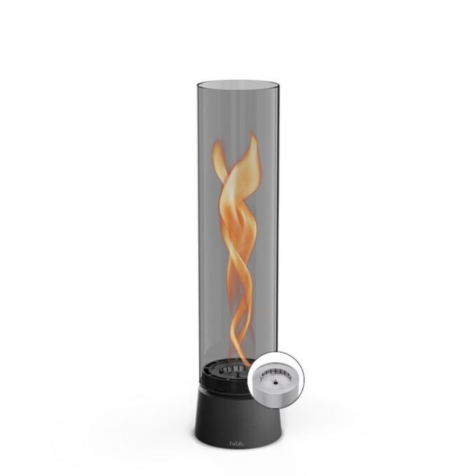Cette lampe / feu de table fonctionne au bio éthanol. Le feu tourbillonne dans le cylindre en verre ce qui nous offre un spectacle étonnant et procure une chaleur équivalente à un chauffage de 2000 W.