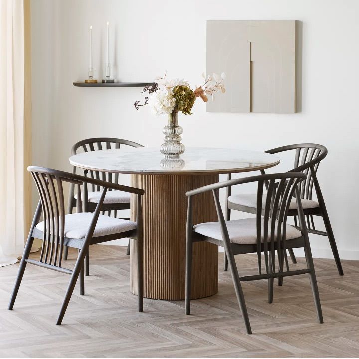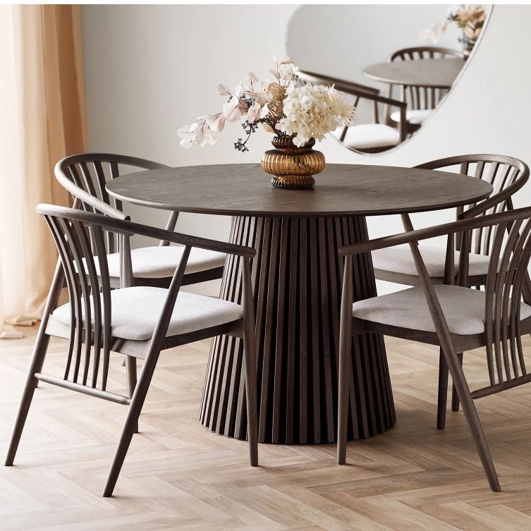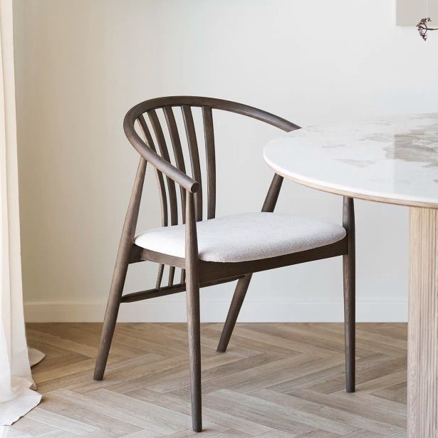 Structure en chêne massif, teinté « fumée », l’assise est en tissu 100% polyester.