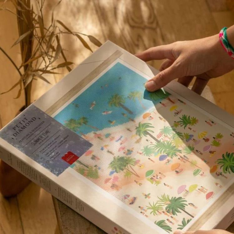 Commencez par soulever une petite partie de la feuille plastifiée (sans tout retirer d’un coup) pour travailler confortablement zone par zone. Versez les diamants de la couleur choisie dans le petit contenant fourni, puis encollez l’embout du stylet grâce à un carré de colle inclus. Cela vous permettra de poser chaque diamant précisément.