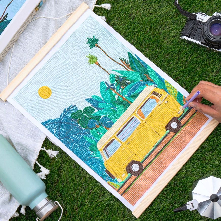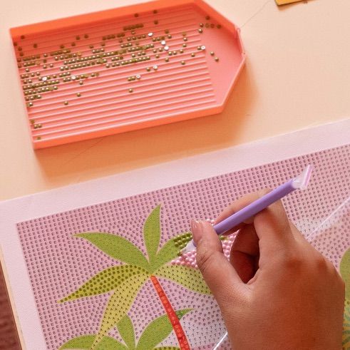 Commencez par soulever une petite partie de la feuille plastifiée (sans tout retirer d’un coup) pour travailler confortablement zone par zone. Versez les diamants de la couleur choisie dans le petit contenant fourni, puis encollez l’embout du stylet grâce à un carré de colle inclus. Cela vous permettra de poser chaque diamant précisément.