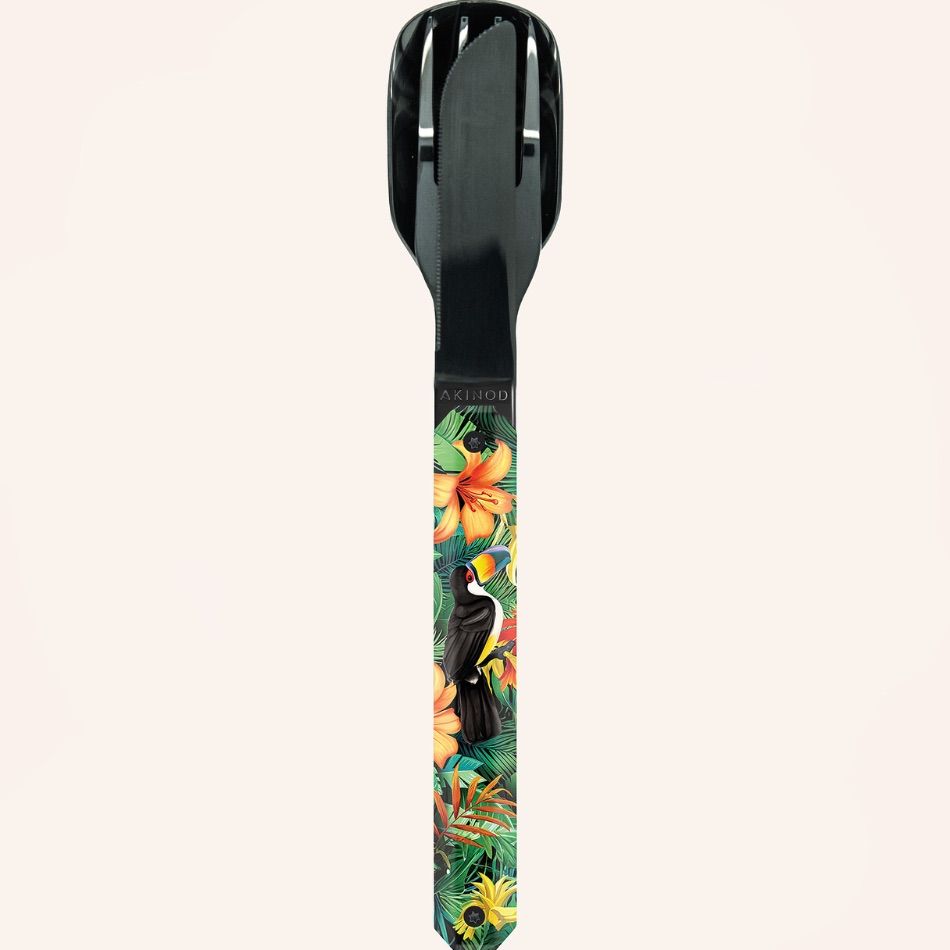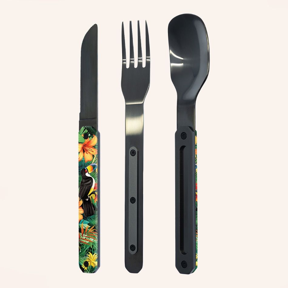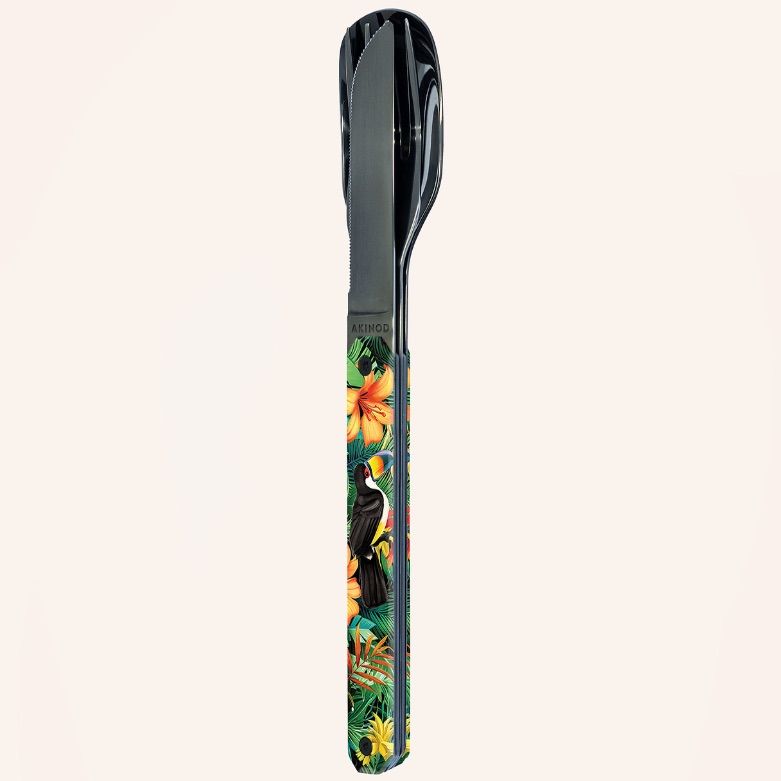 Couverts en acier inoxydable, composé d’une grande cuillère, d’une fourchette 4 dents et d’un couteau à lame micro dentée. Assemblage aimanté ce qui permet de regrouper en « 2 clics » les couverts ensemble…. Ils sont prêt à être à nouveau utilisés ! et ils sont toujours ensemble !