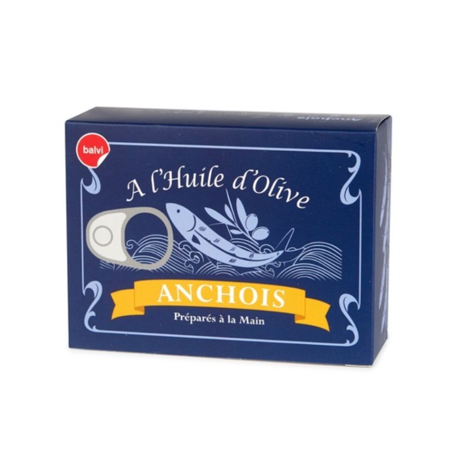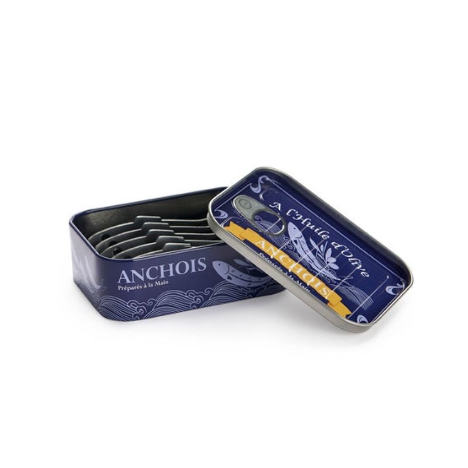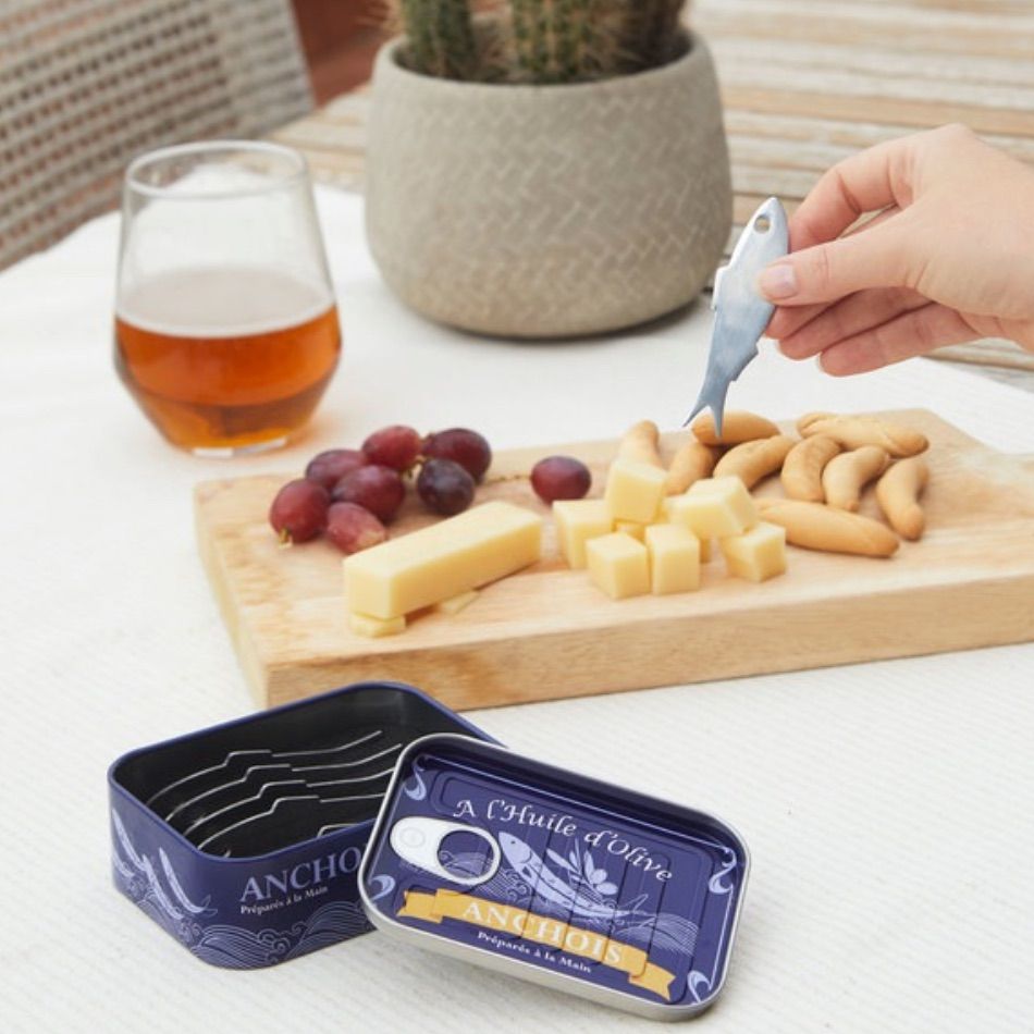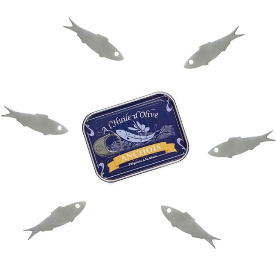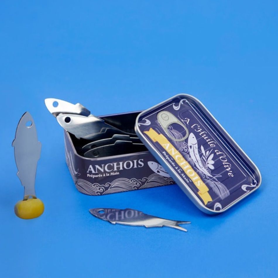 Set de 6 pics apéritif en forme d’anchois, présenté dans une boîte à sardines à l’ancienne. Les pics sont en acier inoxydable.